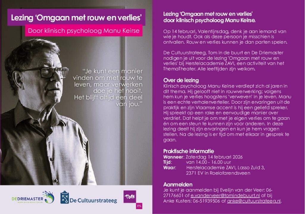 De Cultuurstrateeg, Tom in de buurt en De Driemaster nodigen je uit voor de lezing ‘Omgaan met rouw en verlies’ bij Herstelacademie ZAVI, een activiteit van het ThemaTheater. Alle leeftijden zijn welkom. Je kunt je aanmelden bij Evelijn van der Veer: 06-27176601 of e.vanderveer@tomindebuurt.nl of bij Anke Kusters: 06-51939506 of anke@cultuurstrateeg.nl