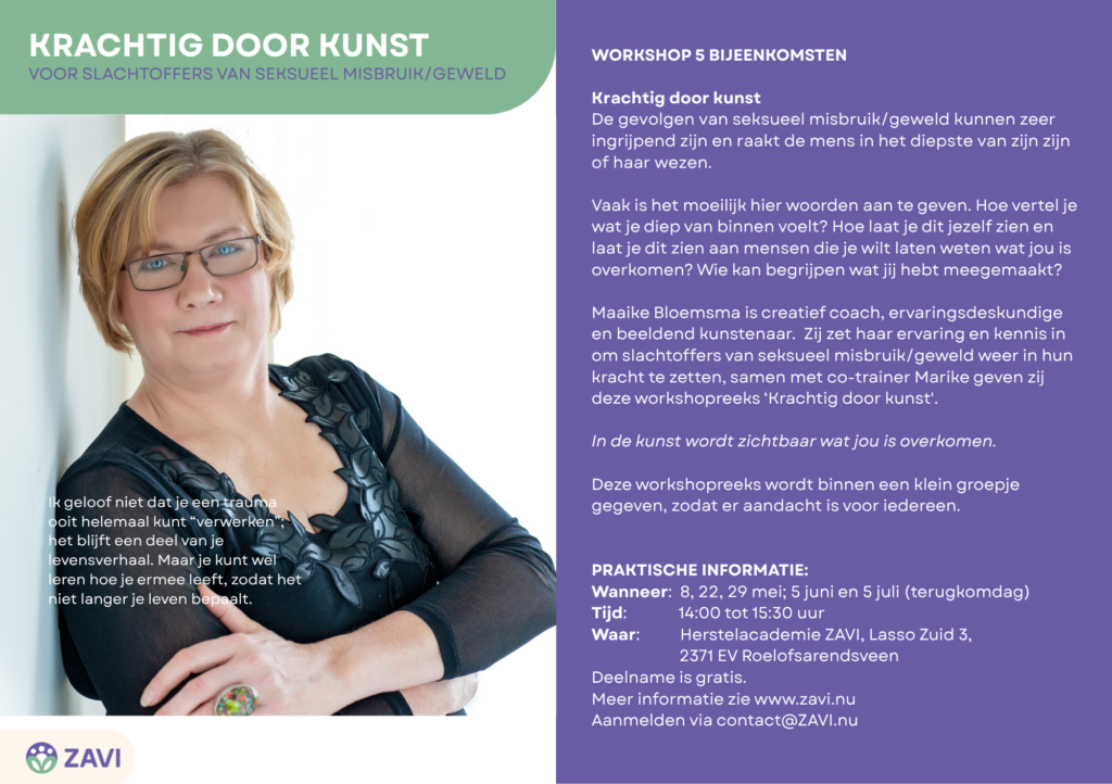 ZAVI is een herstelacademie en community center waar iedereen welkom is: of je nu zoekt naar steun, wilt leren omgaan met uitdagingen, of gewoon op zoek bent naar een plek om te ontmoeten en te groeien. Hier vind je trainingen, workshops en groepen die bijdragen aan persoonlijke ontwikkeling, veerkracht en samenhorigheid.